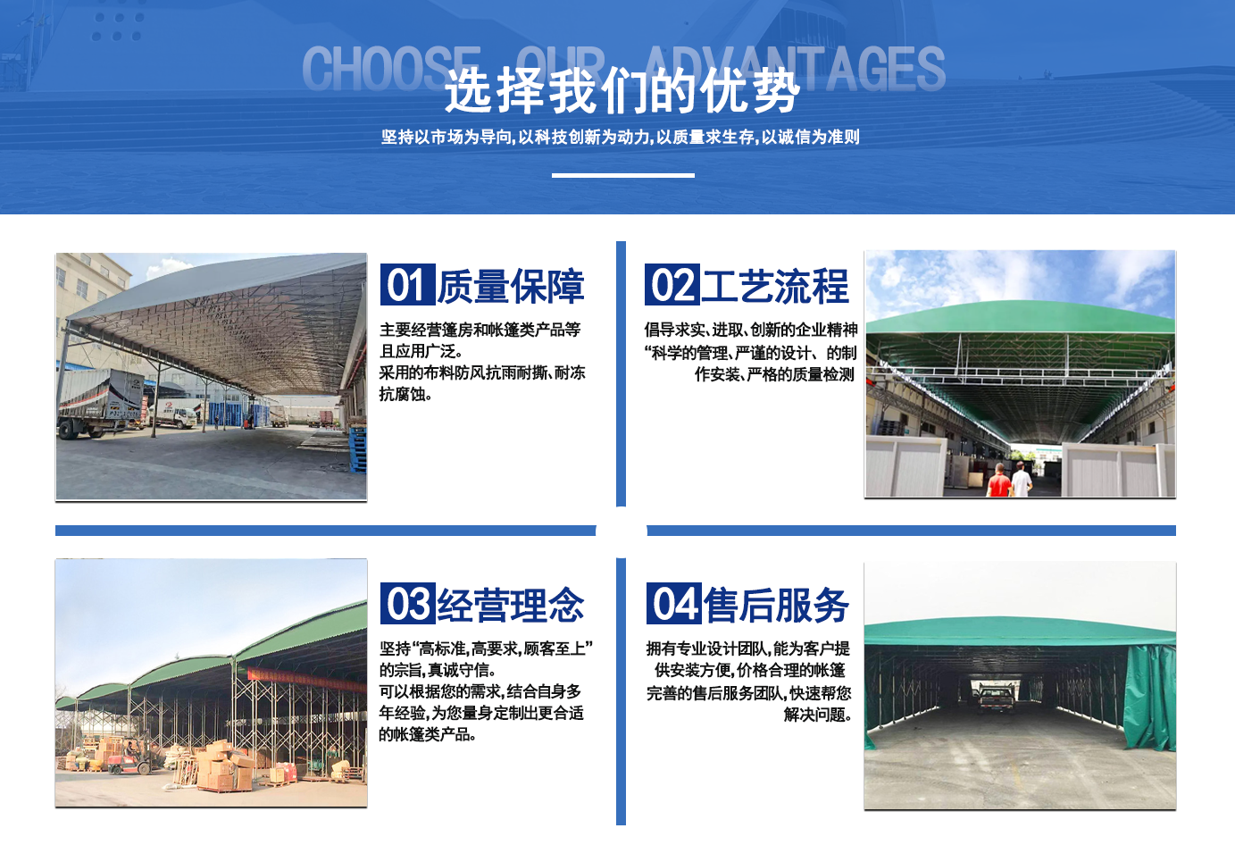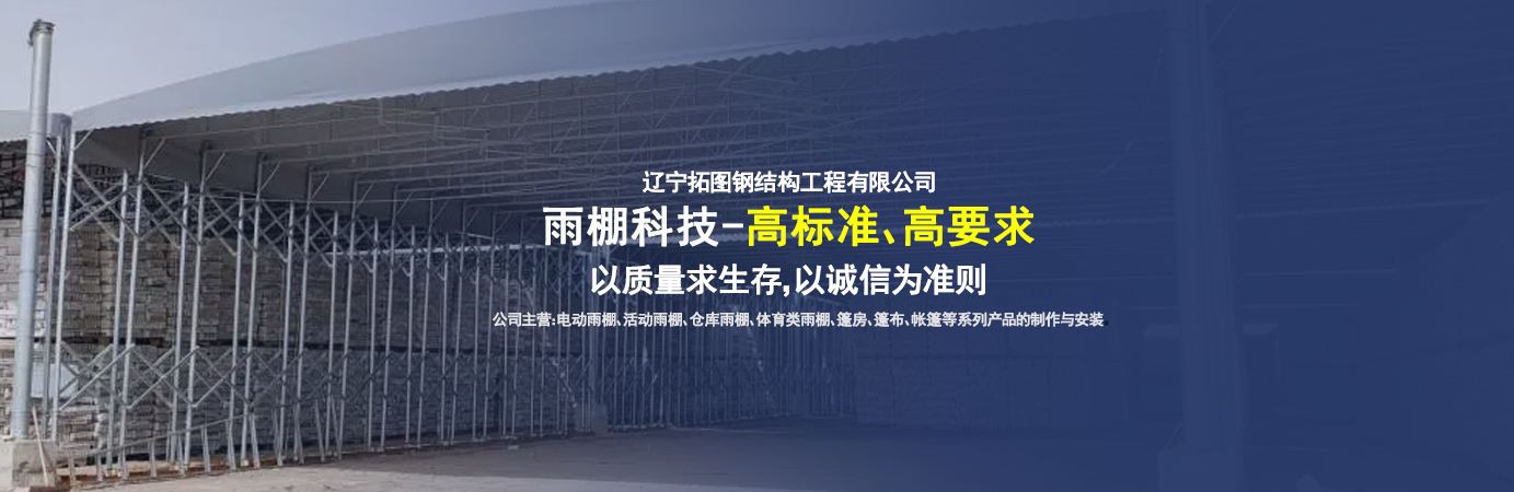 遼寧拓圖鋼結(jié)構(gòu)工程有限公司是一家專業(yè)從事推拉篷設(shè)計、制作、安裝、使用、維修的綜合性公司。公司主營:電動雨棚、活動雨棚、倉庫雨棚、體育類雨棚、篷房、篷布、帳篷等系列產(chǎn)品的制作與安裝。    遼寧拓圖鋼結(jié)構(gòu)工程有限公司堅持以市場為導(dǎo)向,以科技創(chuàng)新為動力,以質(zhì)量求生存,以誠信為準(zhǔn)則,倡導(dǎo)求實、進(jìn)取、創(chuàng)新的企業(yè)精神。“科學(xué)的管理、嚴(yán)謹(jǐn)?shù)脑O(shè)計、 的制作安裝、嚴(yán)格的質(zhì)量檢測、良好的后期服務(wù)成就企業(yè)的信譽(yù),為您提供優(yōu)質(zhì)服務(wù)。    遼寧拓圖鋼結(jié)構(gòu)工程有限公司傾力于開發(fā)應(yīng)用三維空間結(jié)構(gòu)與新材料的結(jié)合,將廣告藝術(shù)視覺表現(xiàn)形式與張力膜材科學(xué)的結(jié)合,推出多彩推拉蓬,依靠先進(jìn)的科學(xué)技術(shù),將推拉蓬建筑表現(xiàn)形式無限延伸,立志走在建筑科學(xué)的前沿,引導(dǎo)建筑時尚潮流,我們的目標(biāo)是使推拉蓬建筑在中國發(fā)展壯大。    遼寧拓圖鋼結(jié)構(gòu)工程有限公司憑著極強(qiáng)的事業(yè)熱情和豐富的專業(yè)經(jīng)驗以“勤勉進(jìn)取、銳意創(chuàng)新、至誠至信”的精神使公司得到迅速健康發(fā)展,業(yè)務(wù)范圍遍及全國。科學(xué)的管理、嚴(yán)謹(jǐn)?shù)脑O(shè)計、高標(biāo)準(zhǔn)的制作安裝流程,嚴(yán)格把控產(chǎn)品質(zhì)量,熱誠的售后服務(wù)是企業(yè)競爭力的源泉。    遼寧拓圖鋼結(jié)構(gòu)工程有限公司人愿以最誠摯的態(tài)度,歡迎廣大客戶的蒞臨與溝通!愿為市場提供優(yōu)...